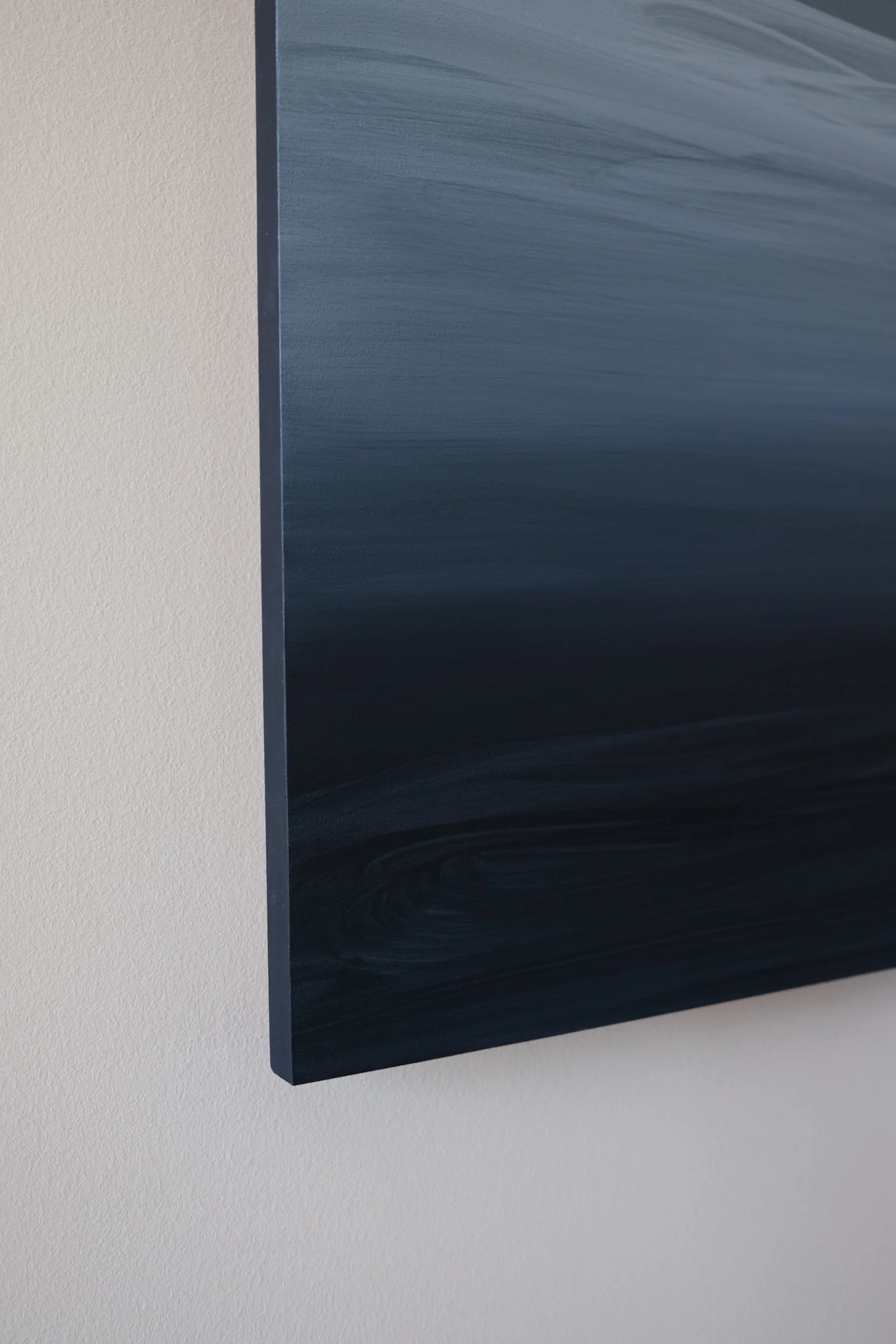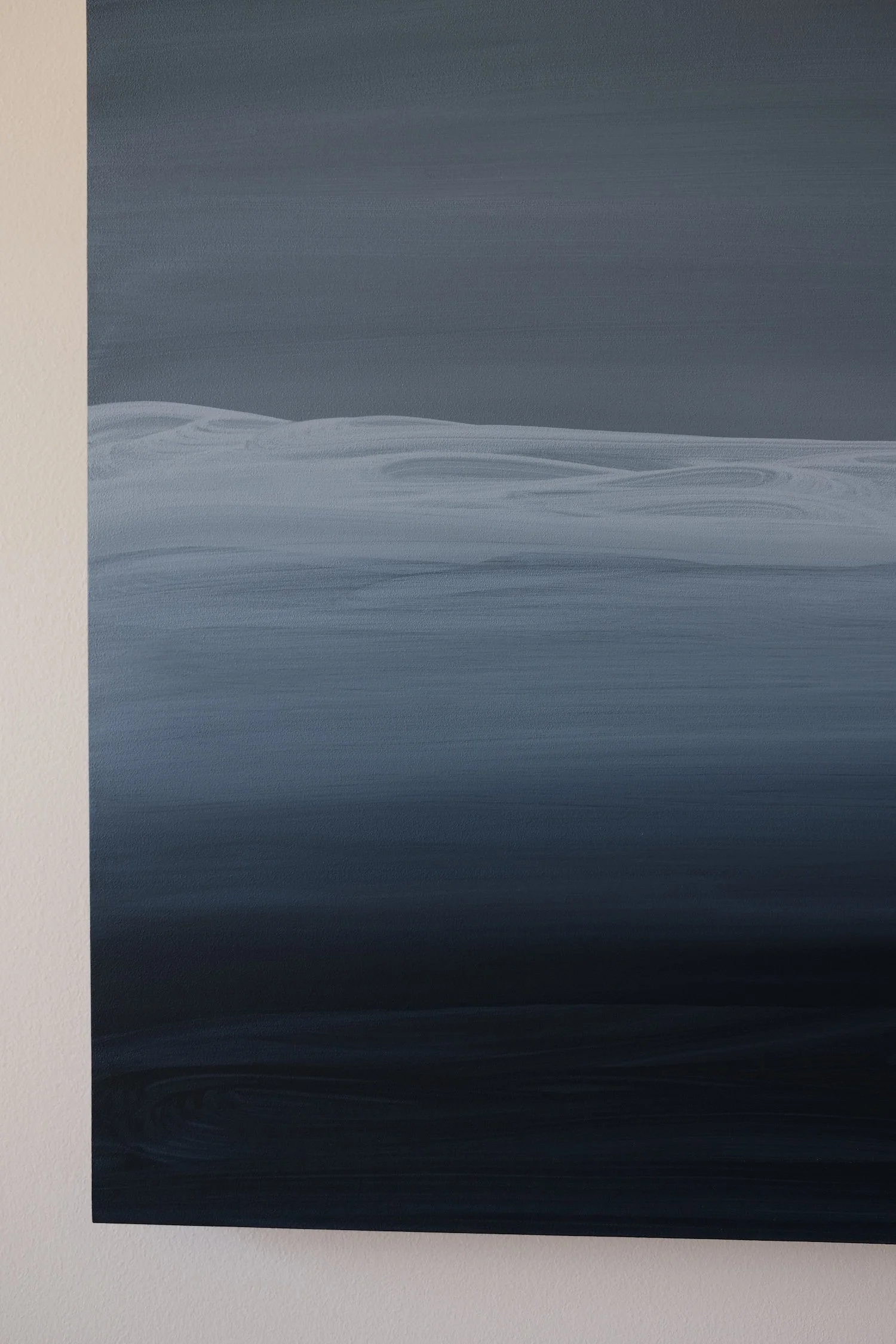 Caitlin Rigby’s paintings navigate environments of intuitive, abstract landscapes, guided by the power of gesture and the poetry of form. Her work unfolds as contemplative windows into atmosphere and memory, built through layered surfaces that suggest place without defining it. Working within a limited palette of blues, Rigby develops a visual language through overlapping brushstrokes and layered washes. Attuned to the surface beneath her paint, she remains consciously engaged with its warmth and material presence, which quietly enrich her palette and forms. Rigby’s compositions become reflective, meditative spaces—open to interpretation, echoing currents of melancholy and textures of longing.