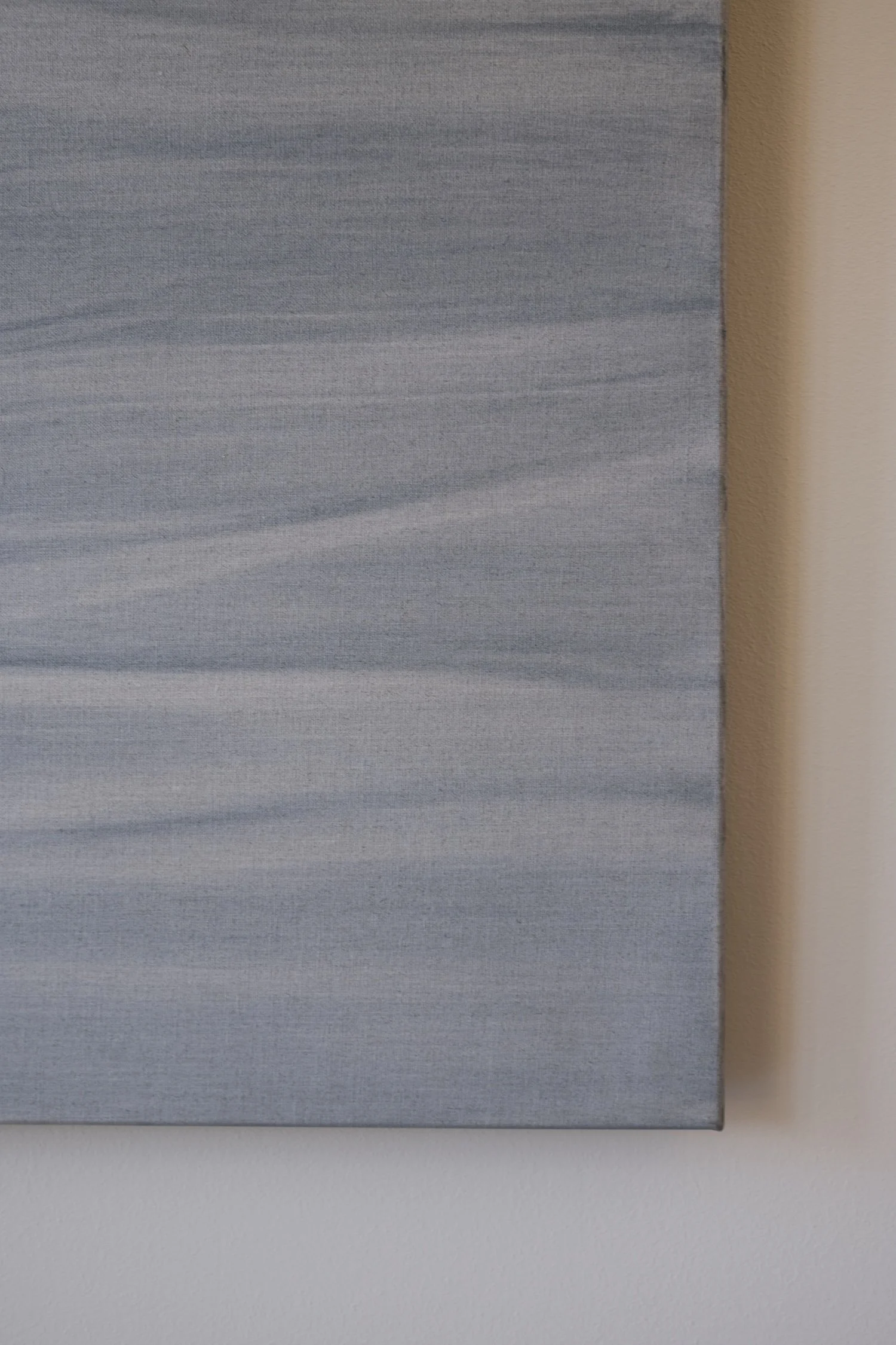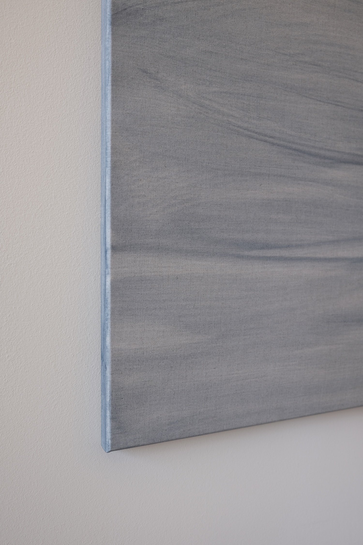 Caitlin Rigby’s paintings navigate environments of intuitive, abstract landscapes, guided by the power of gesture and the poetry of form. Her work unfolds as contemplative windows into atmosphere and memory, built through layered surfaces that suggest place without defining it. Working within a limited palette of blues, Rigby develops a visual language through overlapping brushstrokes and layered washes. Attuned to the surface beneath her paint, she remains consciously engaged with its warmth and material presence, which quietly enrich her palette and forms. Rigby’s compositions become reflective, meditative spaces—open to interpretation, echoing currents of melancholy and textures of longing.