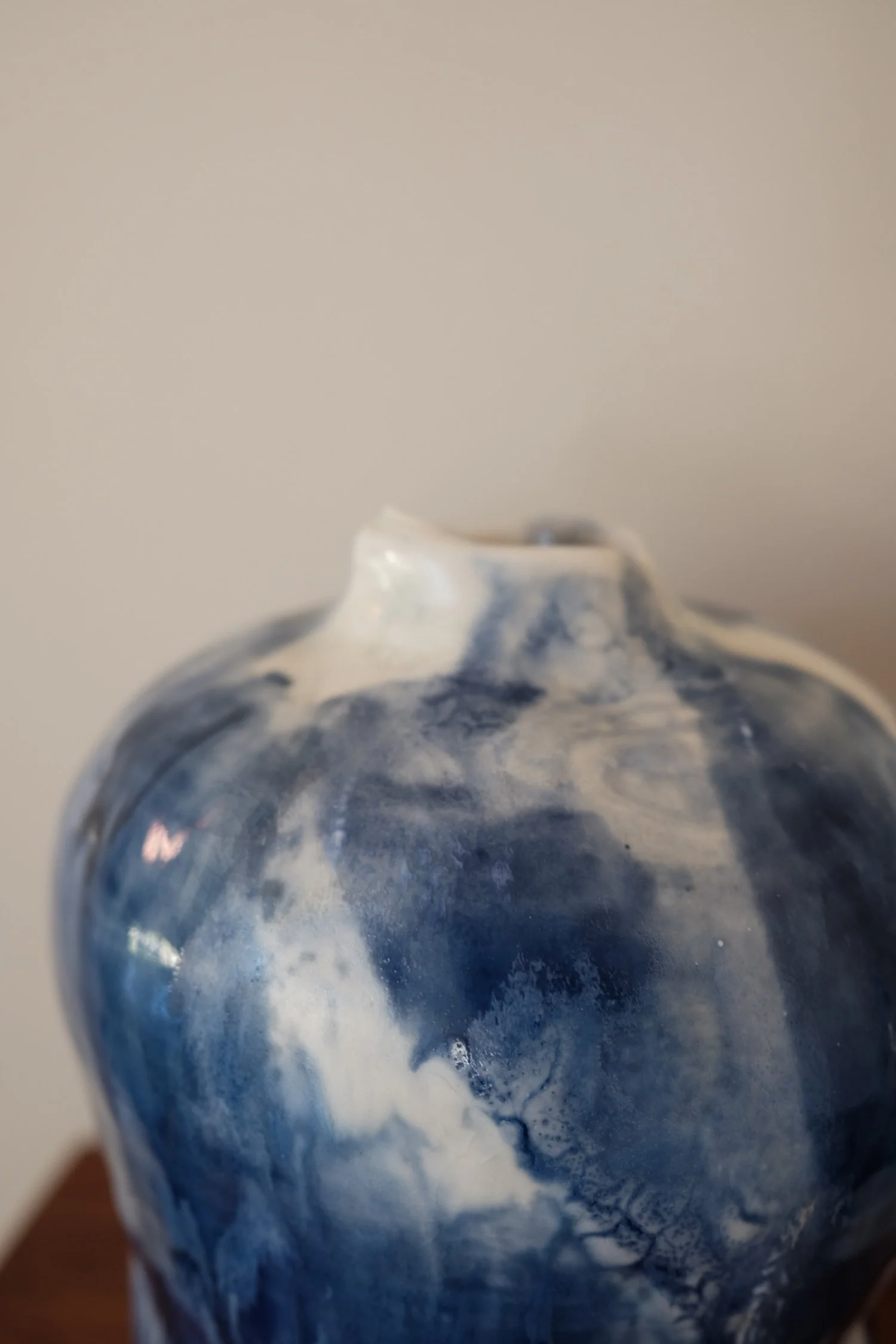 This body of work marks a new experimental direction in my practice. Working exclusively in porcelain (a material synonymous with China), I’m exploring the visual language of blue and white ceramics not through hand-painted decoration, but through glaze chemistry, material interaction, and the unpredictability of the firing process.