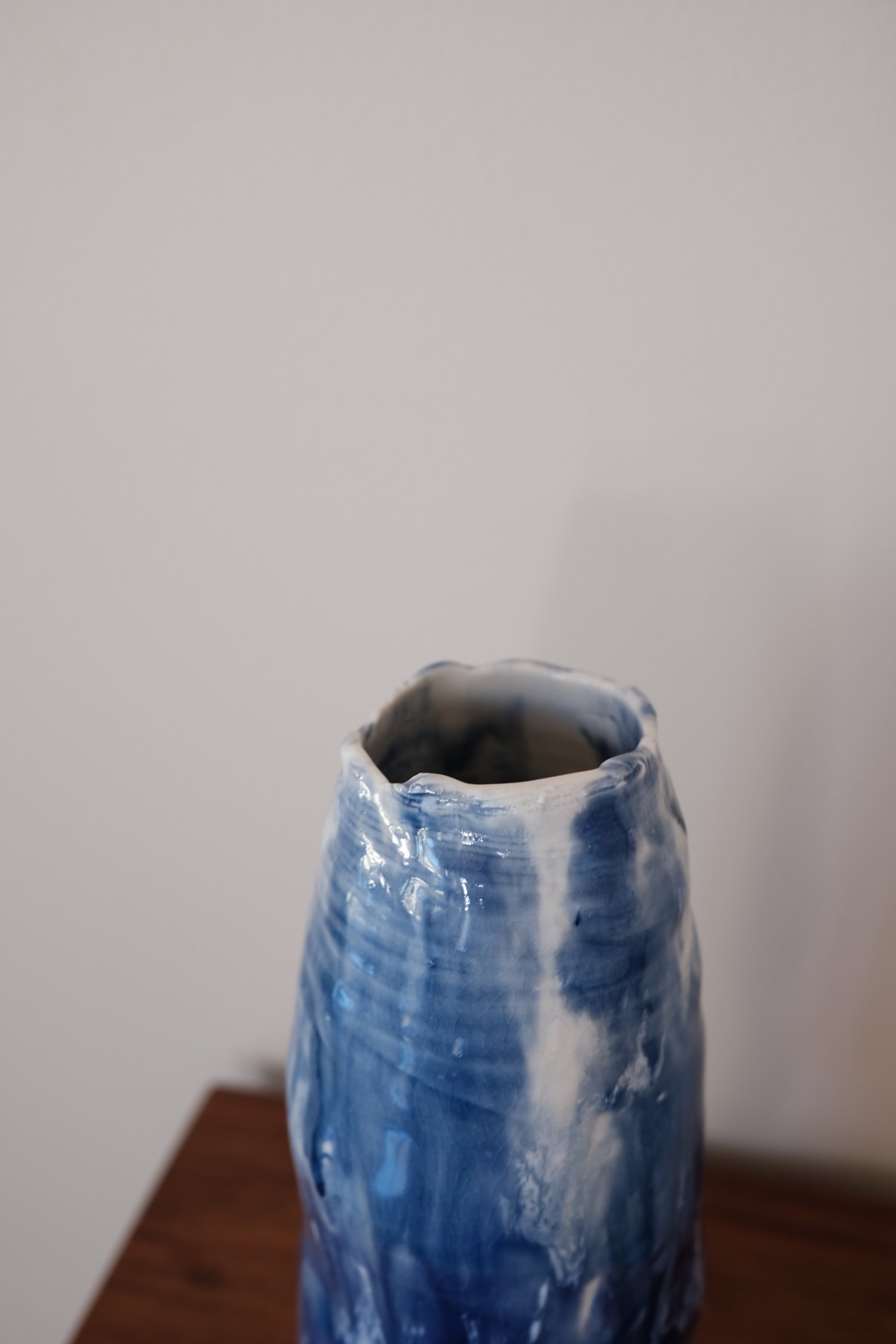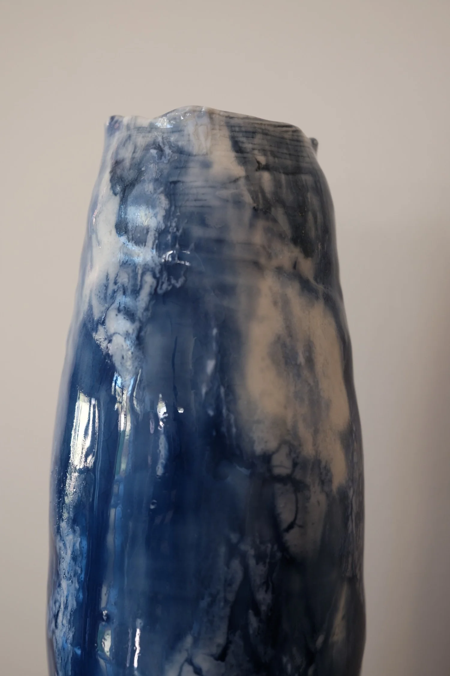 This body of work marks a new experimental direction in my practice. Working exclusively in porcelain (a material synonymous with China), I’m exploring the visual language of blue and white ceramics not through hand-painted decoration, but through glaze chemistry, material interaction, and the unpredictability of the firing process.