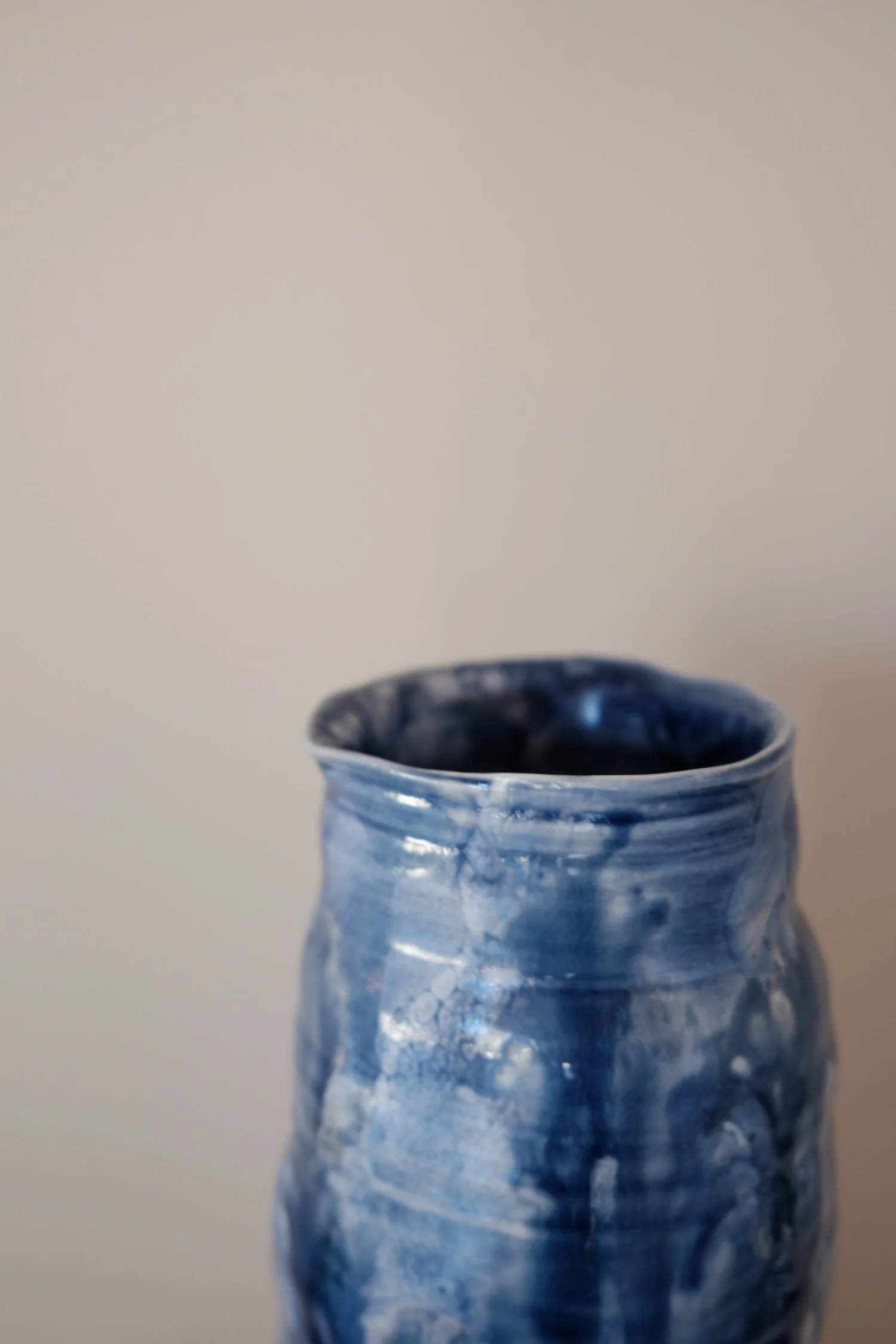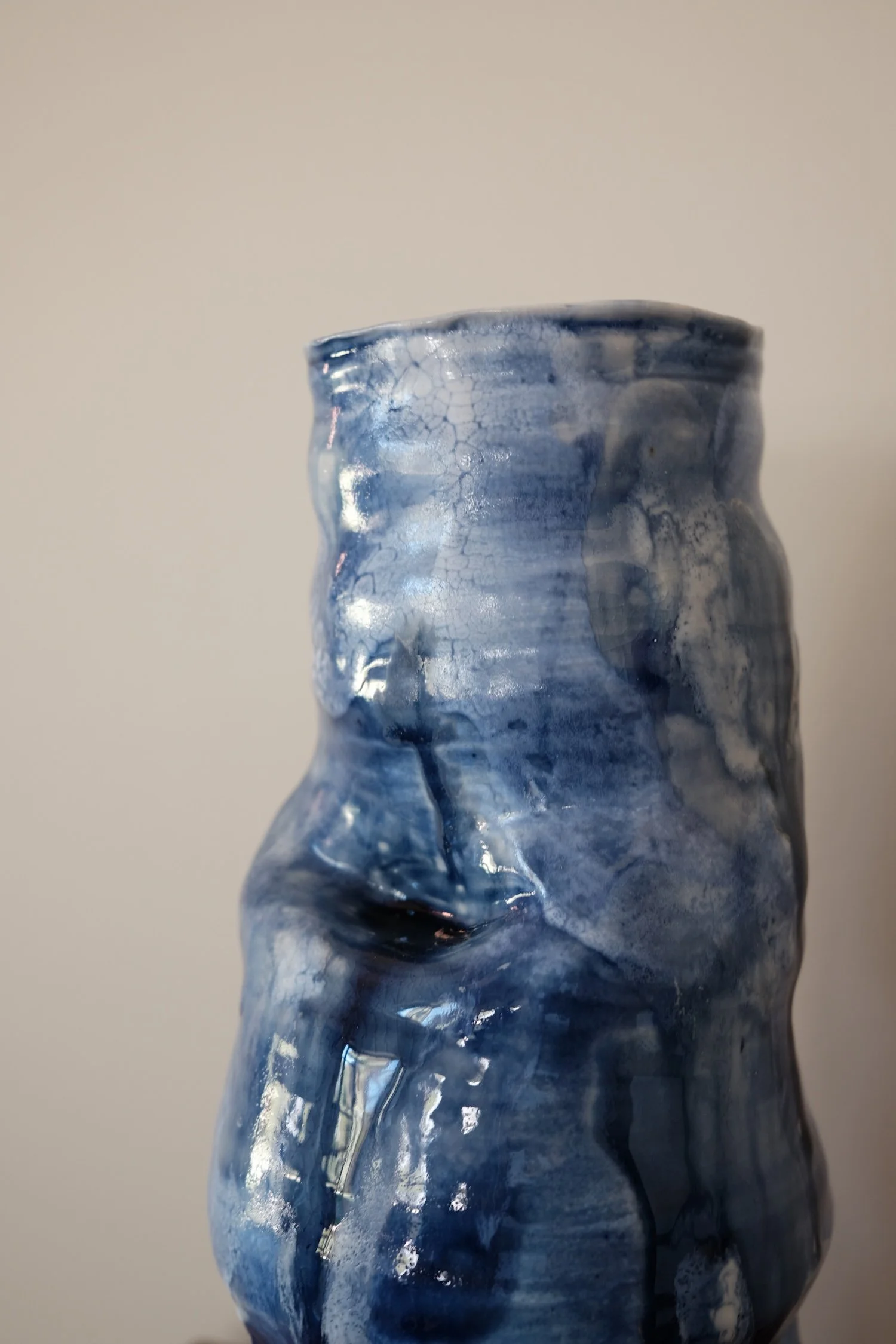 The works move away from traditional vessel logic toward abstraction and sculptural presence. Forms are minimal and softly contoured, scaled larger than my previous pieces, allowing surface to carry the primary visual weight. Layered blues, tonal shifts, and painterly effects emerge through firing rather than direct control.