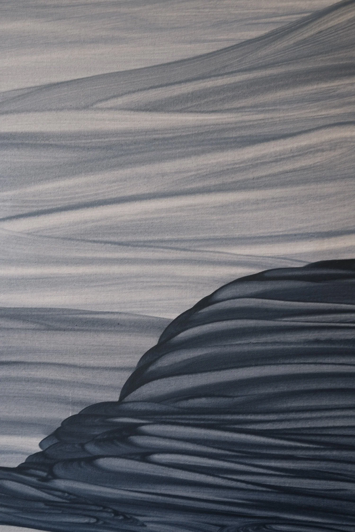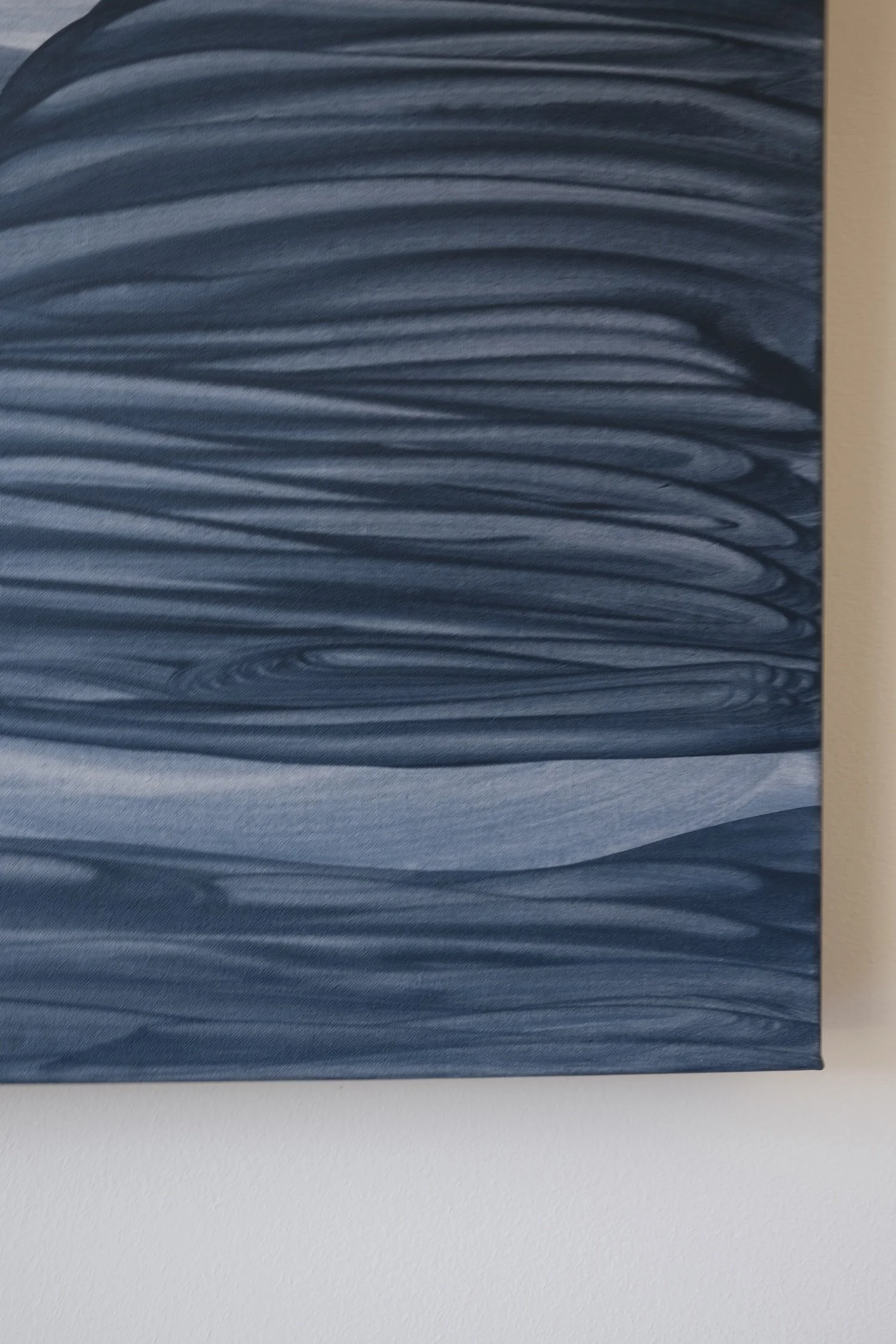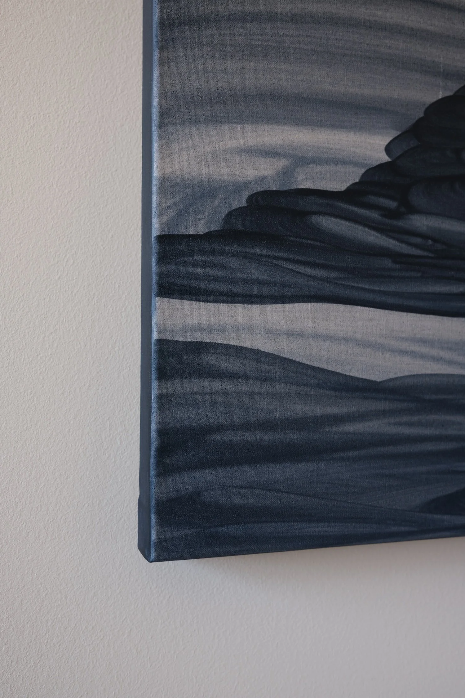 Blue operates as both subject and material in my paintings. It is not only the palette I work with but also the emotional terrain I inhabit within my imagery. Its associations with water, sky, and emotional depth place the work in a liminal space—between the physical and the psychological, between place and dream. Within this space, horizons and tides emerge, offering calm and safety while retaining an undercurrent of melancholy and grief. Layered blues create emotional texture—diluted and translucent in some areas, dense and saturated in others—as if feeling has been reflected in the surface, carrying the quiet beauty of nature and the deepening of memory.