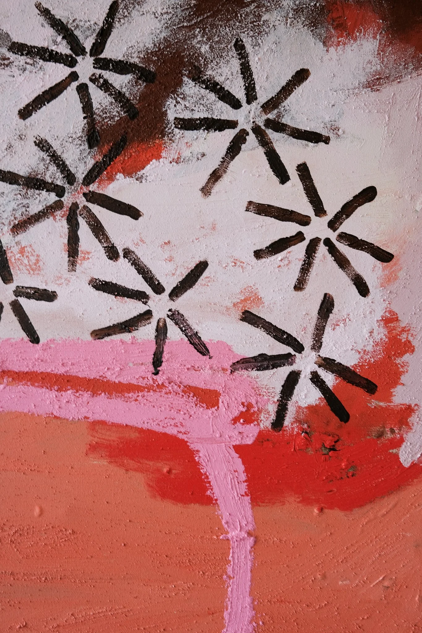 I mix sand into paint for that rough, earthy feel, layering acrylics with oil sticks so colour and texture meet in surprising ways. It’s my way of grounding myself, connecting to place, and letting my inner child guide the work, just as nature intended.