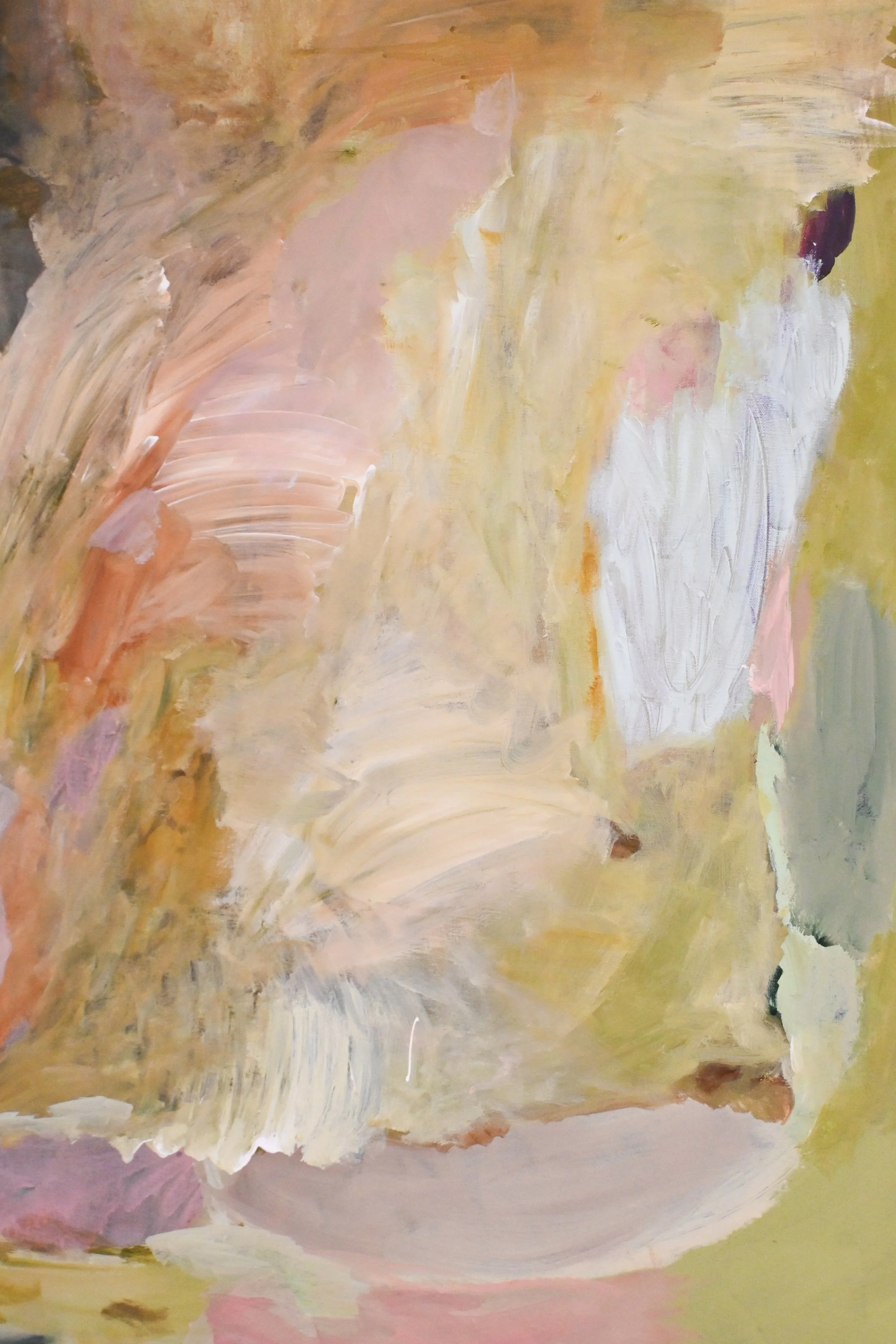 At first glance, the palette is warm, inviting — hues of blush, mist, pale sky and softened earth. Yet beneath this gentleness sits something deeper: an awareness of transience. Of time passing. Of bodies that move through landscape and eventually return to it.
