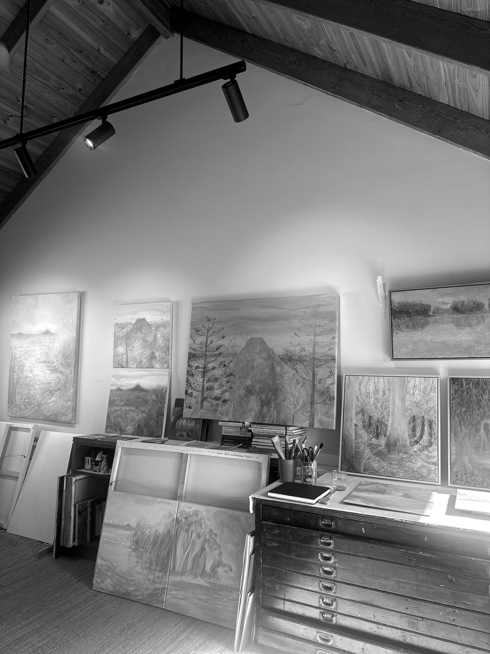 I find it takes time to settle into an unfamiliar landscape. There is a period of exploration and curiosity as my eyes adjust to different forms, both near and far. This leads to a kind of enchantment with the extraordinary that can always be found in wild places. While observing and recording, a deeper enchantment takes hold as I notice and sense everything around me. Small fish swim around my feet, a goanna casually slidies past beneath towering pink paperbarks. The air is filled with the song of the currawong, or the flash of pale-headed rosellas as they flit past. I aim to present an enchanted landscape that is soft, nuanced, expansive, light and dissolving—all at once.