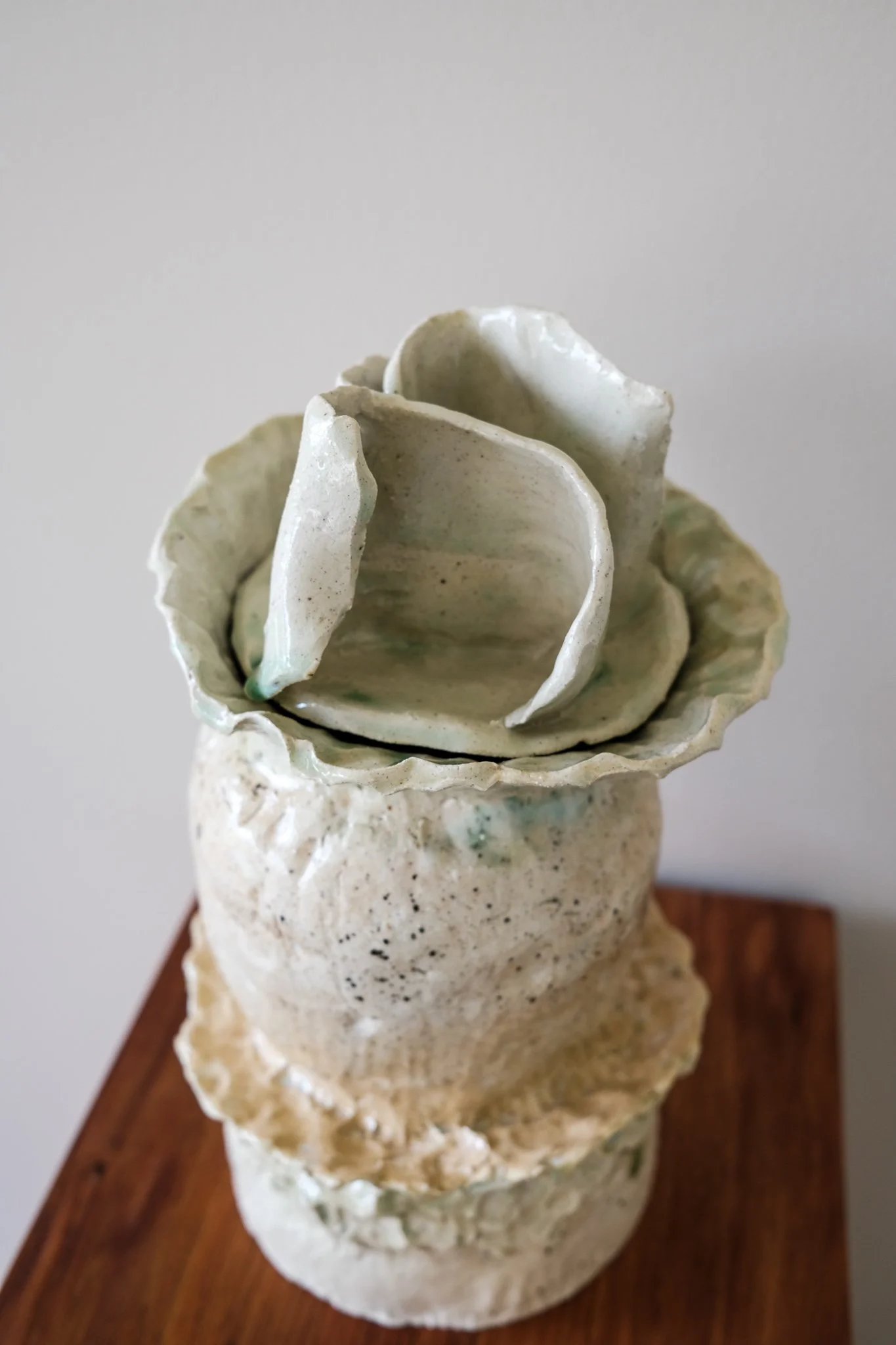 'Urns for the Living'. My sculpture possesses textures and shapes reflecting my interest in materiality, purity of form and preference of seeing the hand of the artist. I have made multifunctional artworks, blurring what is functional and non-functional. A platter to hold ripe fruit, a vessel to hold the live flowers and candles that can never light. My sculpture explores attempts to summon the ineffable into comprehension and to pay tribute to shaping the abstract into recognition.