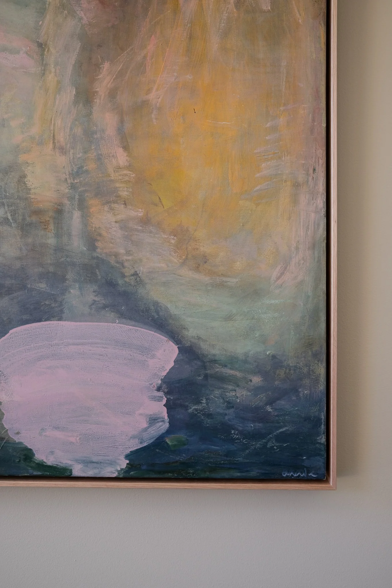 Today, I practice as both an illustrative textile designer and traditional artist through the medium of painting, primarily working with acrylic, soft pastel and oil sticks, and moving between abstract, semi-abstract and still life subjects. My paintings are defined by a soft, feminine palette of pastels and earth tones, evoking a quiet tension between expressive marks of bold colour, and ethereal, dreamlike shapes and poignant vignettes created by layering.