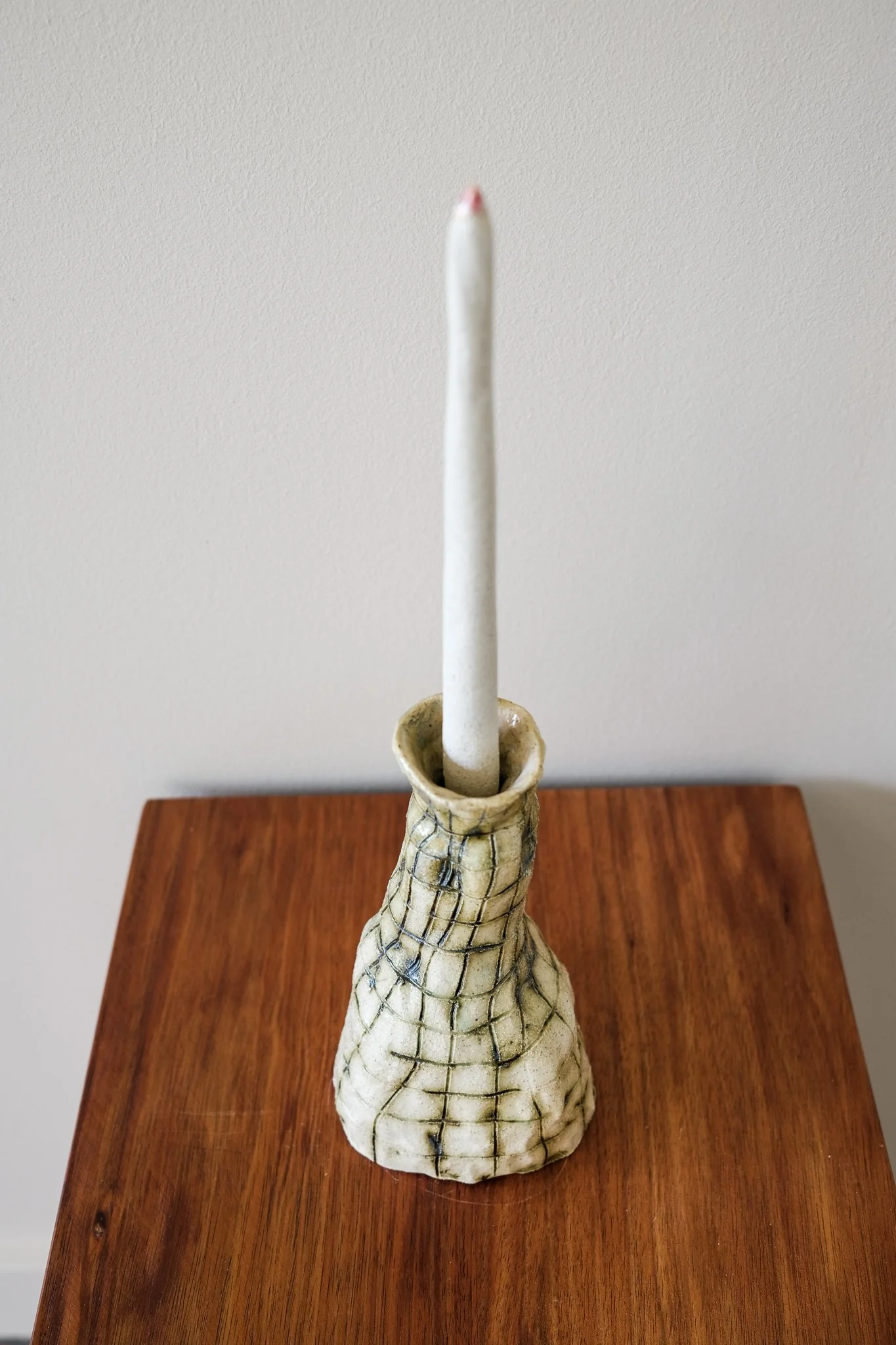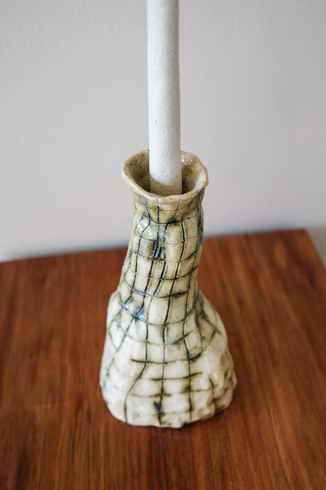 'Urns for the Living'. My sculpture possesses textures and shapes reflecting my interest in materiality, purity of form and preference of seeing the hand of the artist. I have made multifunctional artworks, blurring what is functional and non-functional. A platter to hold ripe fruit, a vessel to hold the live flowers and candles that can never light. My sculpture explores attempts to summon the ineffable into comprehension and to pay tribute to shaping the abstract into recognition.