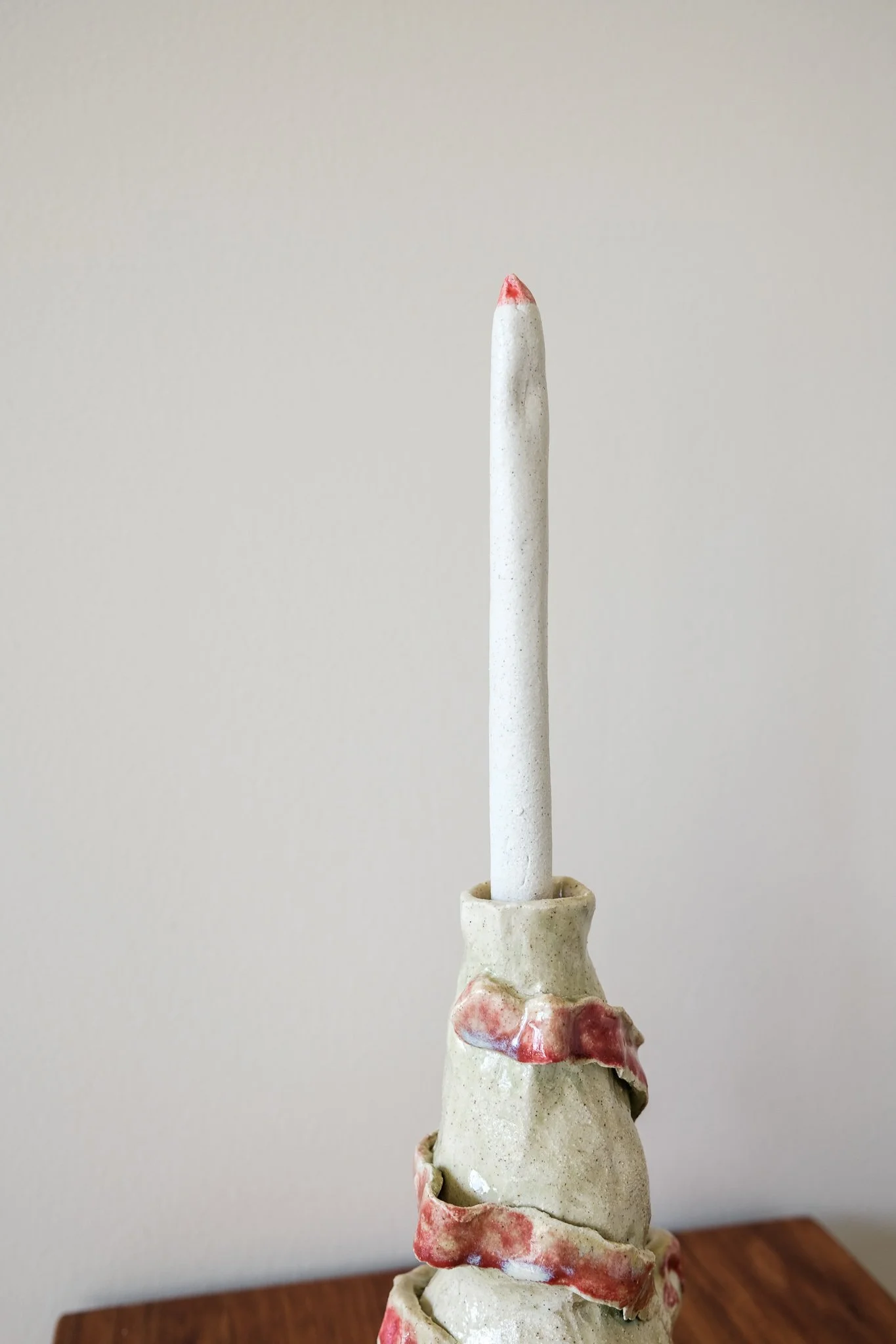 'Urns for the Living'. My sculpture possesses textures and shapes reflecting my interest in materiality, purity of form and preference of seeing the hand of the artist. I have made multifunctional artworks, blurring what is functional and non-functional. A platter to hold ripe fruit, a vessel to hold the live flowers and candles that can never light. My sculpture explores attempts to summon the ineffable into comprehension and to pay tribute to shaping the abstract into recognition.