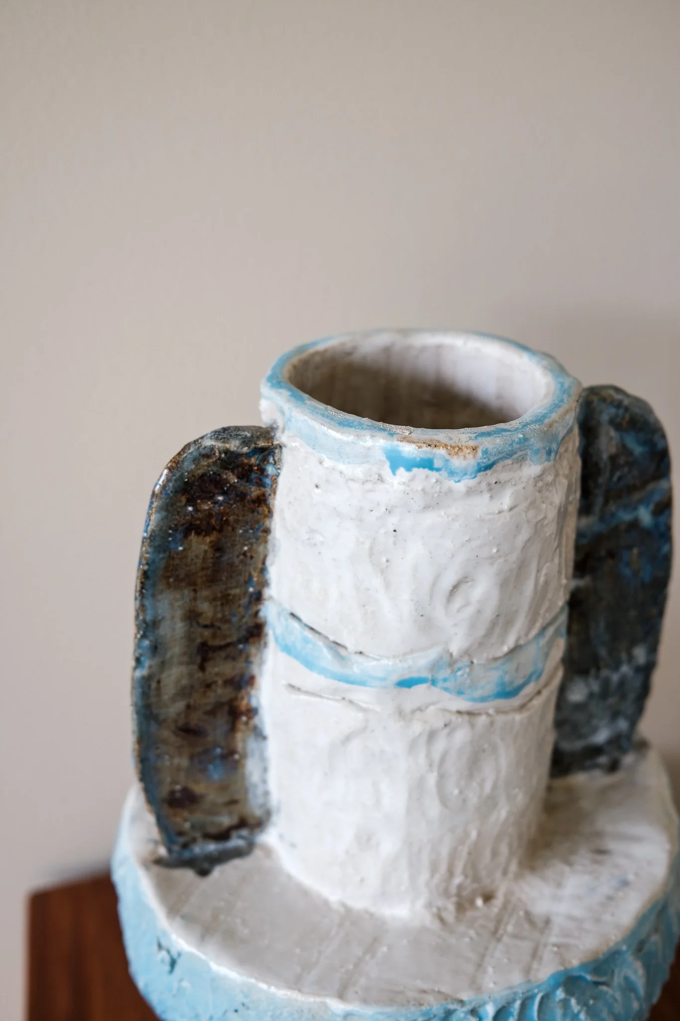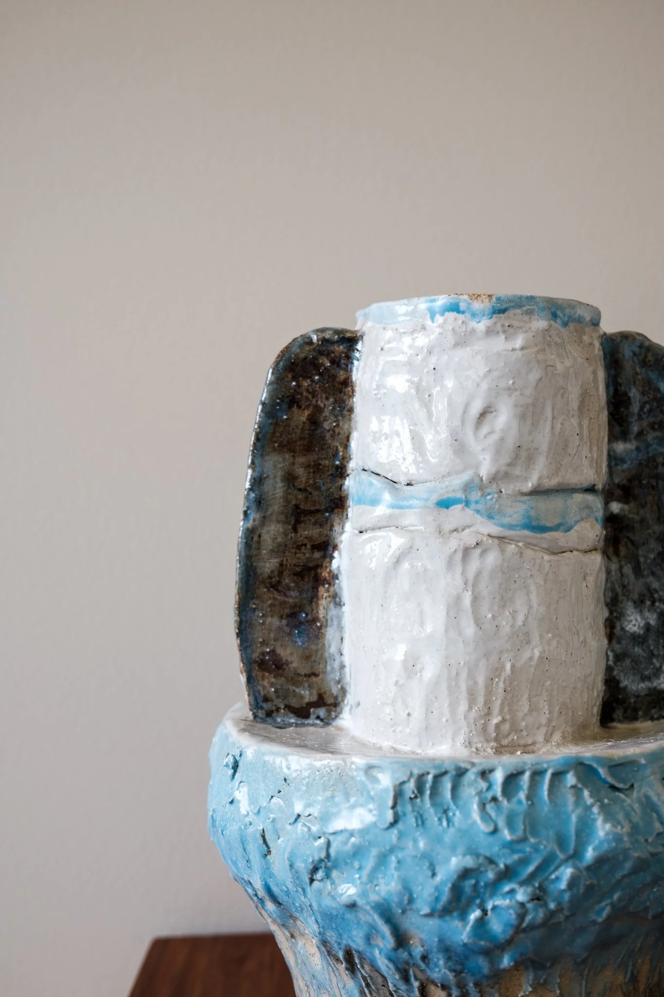 'Urns for the Living'. My sculpture possesses textures and shapes reflecting my interest in materiality, purity of form and preference of seeing the hand of the artist. I have made multifunctional artworks, blurring what is functional and non-functional. A platter to hold ripe fruit, a vessel to hold the live flowers and candles that can never light. My sculpture explores attempts to summon the ineffable into comprehension and to pay tribute to shaping the abstract into recognition.