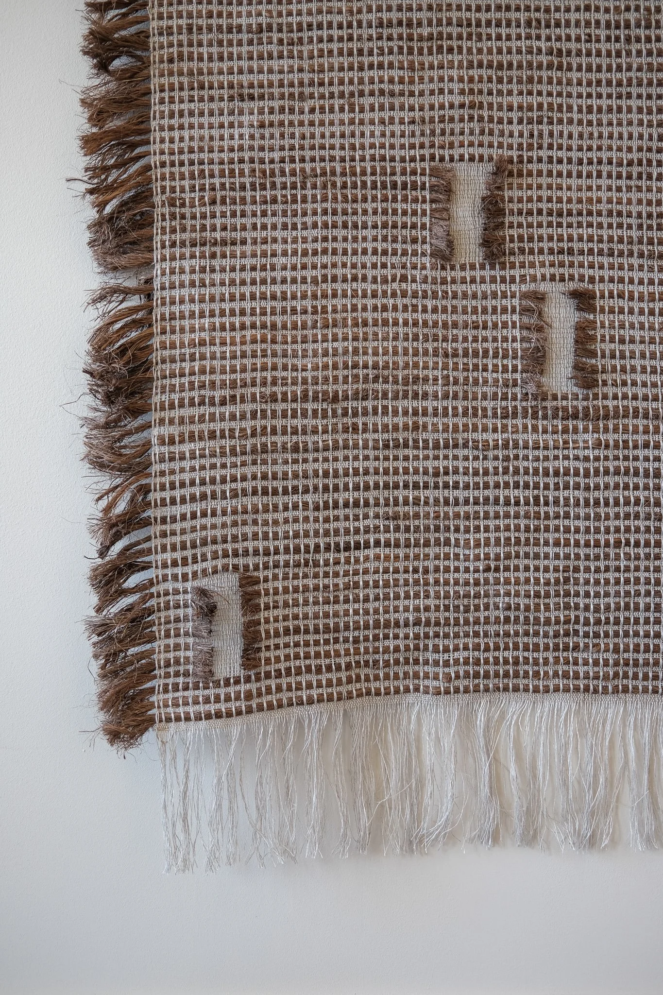 I wanted to capture the feeling of the sun on my back, those long, languid summer days where time loosens. Sun shining, earth baking, heat rising. Naturally dyed silk and Australian wool are combined with painted warps and hammered beads to create quiet but energetic pieces. Banana fibre and grasses lean into the dry heat, bleached tones, kindling. Quiet compositions held together with a material warmth and honesty.