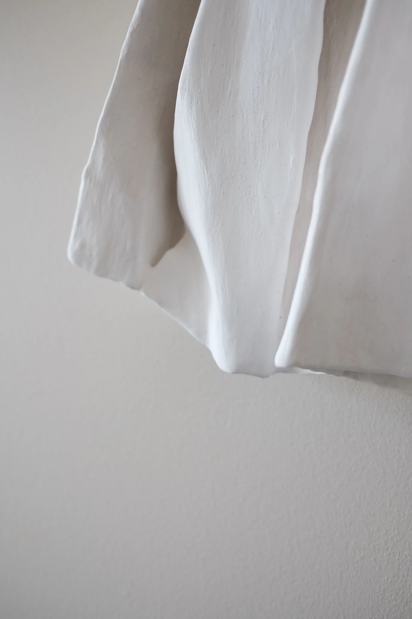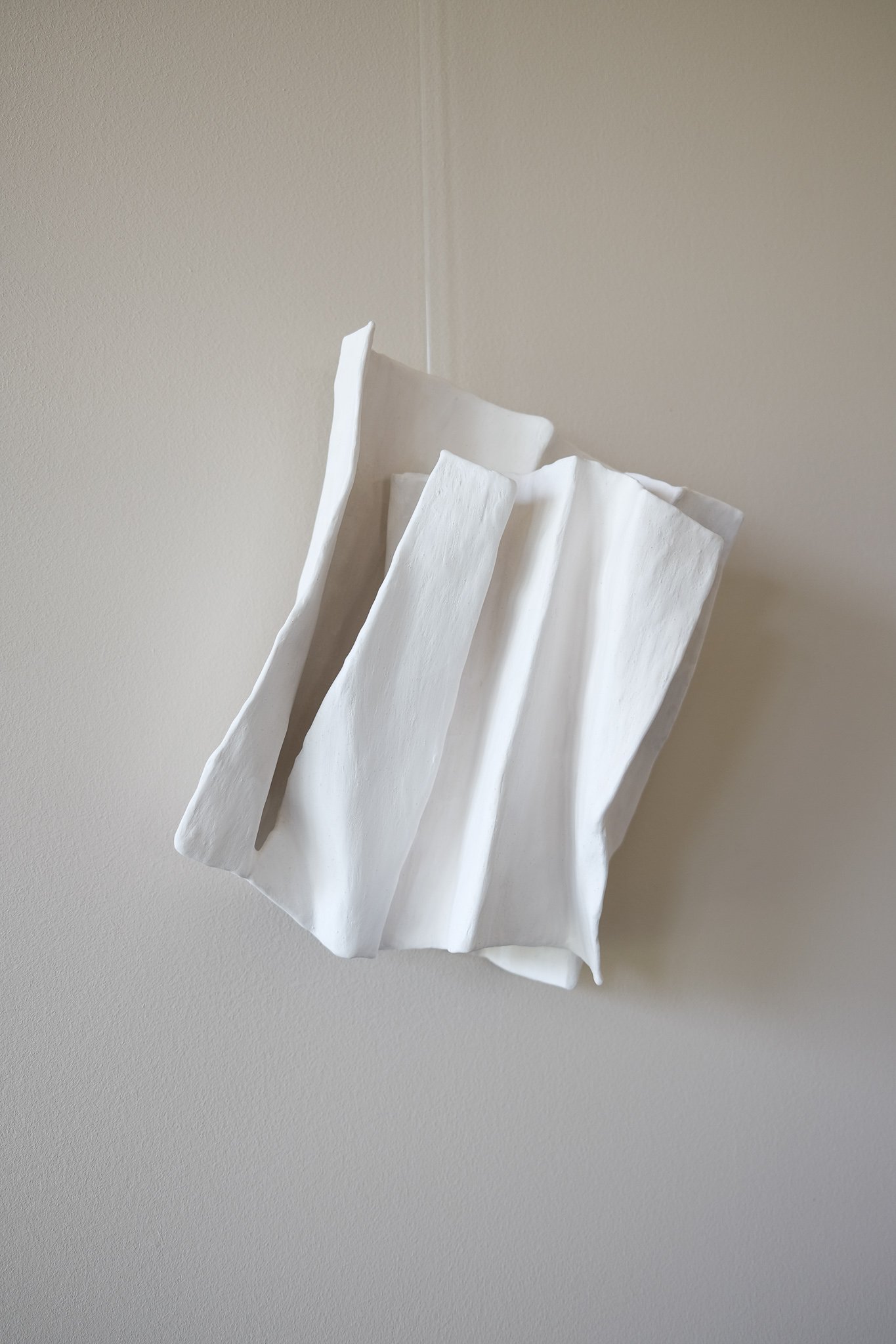Working with recycled paper and plaster, Kelly creates delicate wall sculptures that balance rawness, refinement, and fragility. Each piece emerges through an intuitive process of folding, layering, and shaping—transforming everyday materials and fragments of notebooks, shopping lists, and scrap paper into sculptural compositions that catch and hold the light.