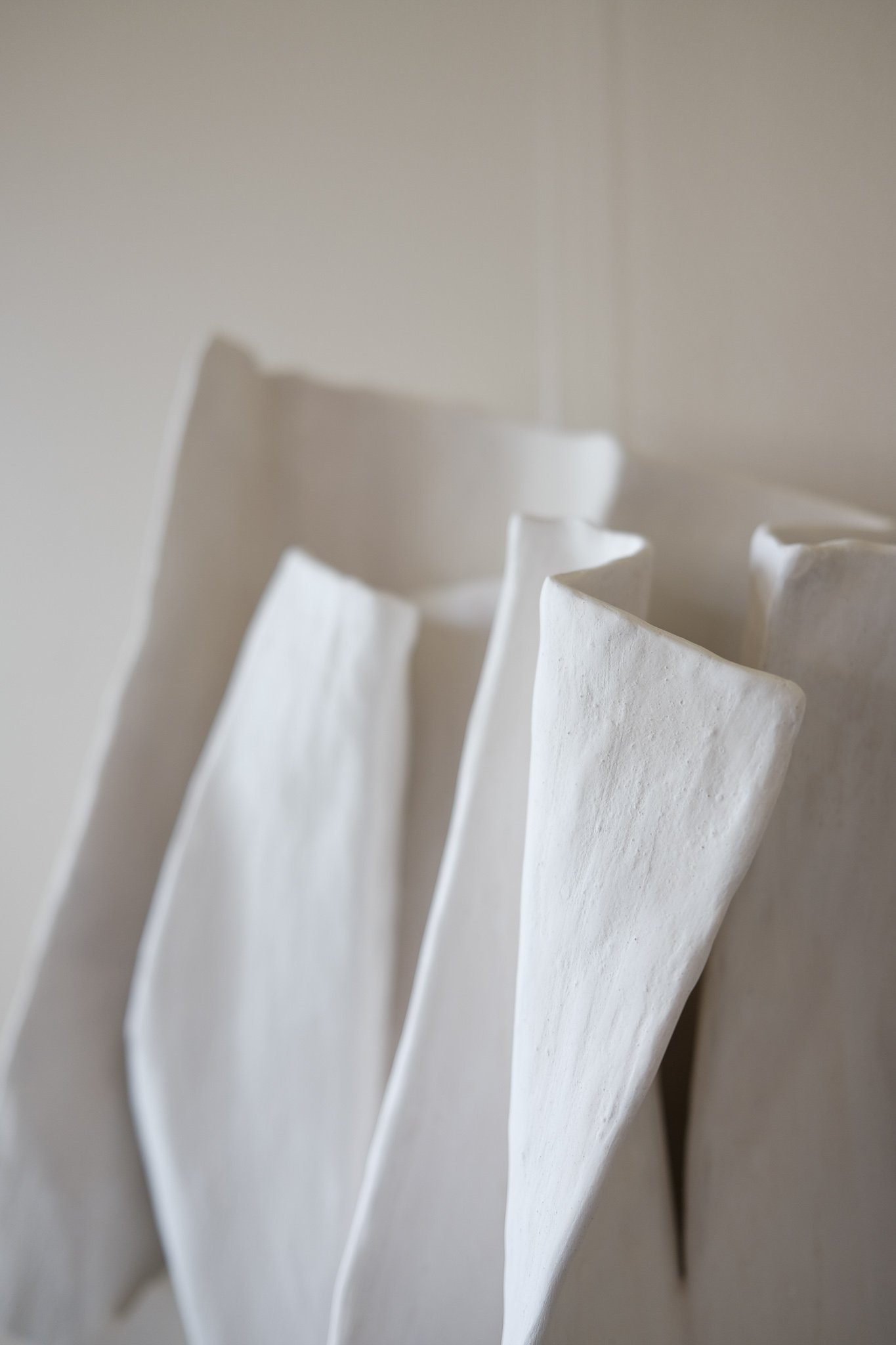 Her works echo the natural world, recalling salt settling on stone, eroded rock formations, peeling paperbark, and tidal-worn shells. Surfaces bear the imprint of a brushstroke; edges hold the crispness of a freshly folded page. These forms invite reflection on the beauty found in everyday materials, the traces of daily life, and the ephemeral moments of shifting light and shadow.
