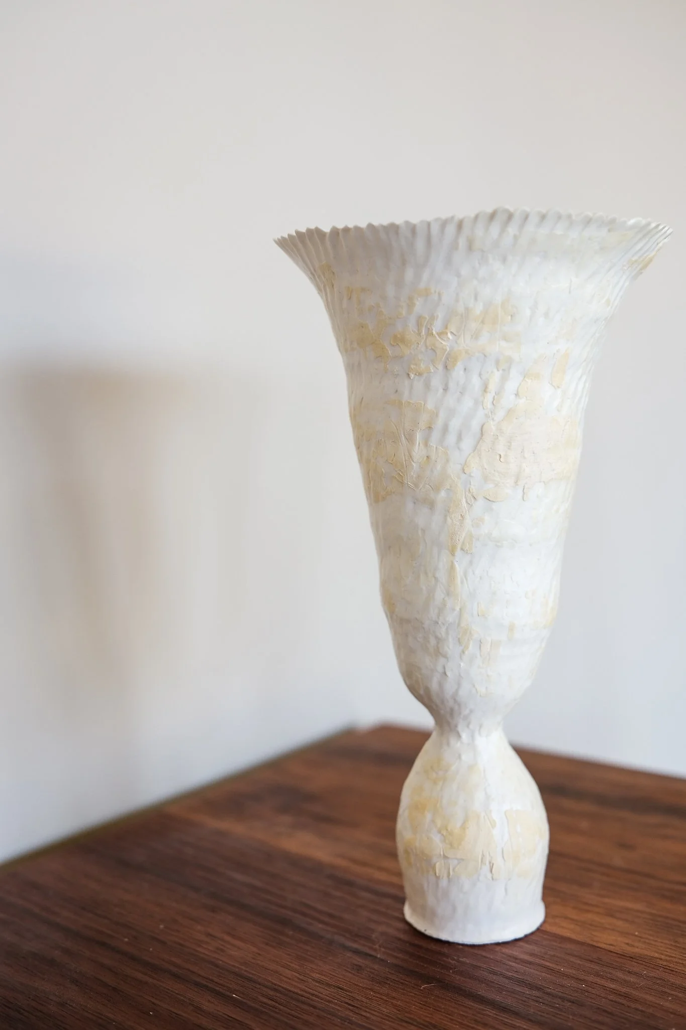 At the intersection of craft and narrative, gốm maker is the material extension of my writing practice. Each sculpture begins with a fragment of text, guiding the slow accumulation of ceramic form and surface. Built gradually over days, the works draw on traditional coiling techniques, rendered contemporary through the use of exceptionally thin, pinched coils, each measuring approximately 0.5 cm at the moment of construction. At this scale, the coils are more acutely responsive to moisture, gravity, and heat, allowing the structure to register all environmental conditions through to the finished form.