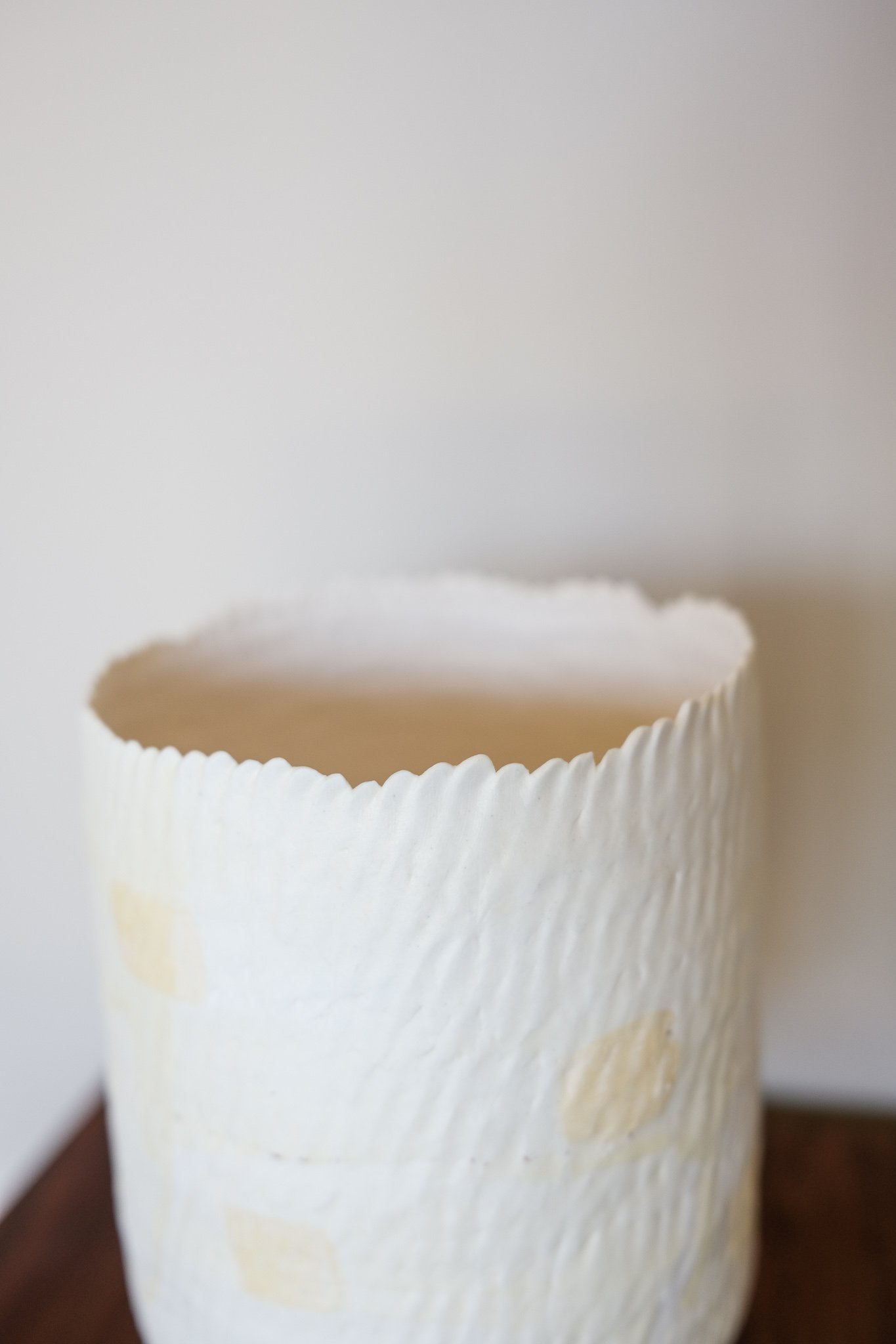 I carried this yellow in my mind during the making. I made glazes of full throated, permanent yellow. I applied them in various combinations on the surface. Then I keep thinking about the texture of stucco flaking in the heat, the dimpled skin of trái thị I grew up smelling, and I returned again and again to this paler, gentler hue, barely perceptible against the translucent porcelain body. The finger marks I left on the coils seem most at home here, the yellow drifting along their edges, slowly tracing the crude shifts of the papery-thin clay as it yields to the kiln’s heat-work, not encrusting over them.