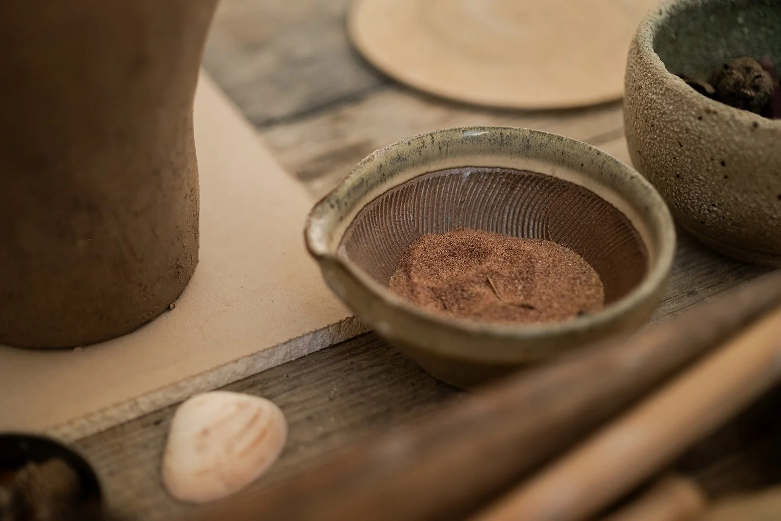 Plant matter, raw pigments, minerals and oxides are pressed, pinched and layered across cloth and vessel, forming surfaces shaped through repetition and duration. Each work holds the imprint of its making — a record of seasonal change, material interaction and accumulated gesture. TRACE considers making as elemental form, where colour, texture and structure emerge through natural processes rather than imposed control.