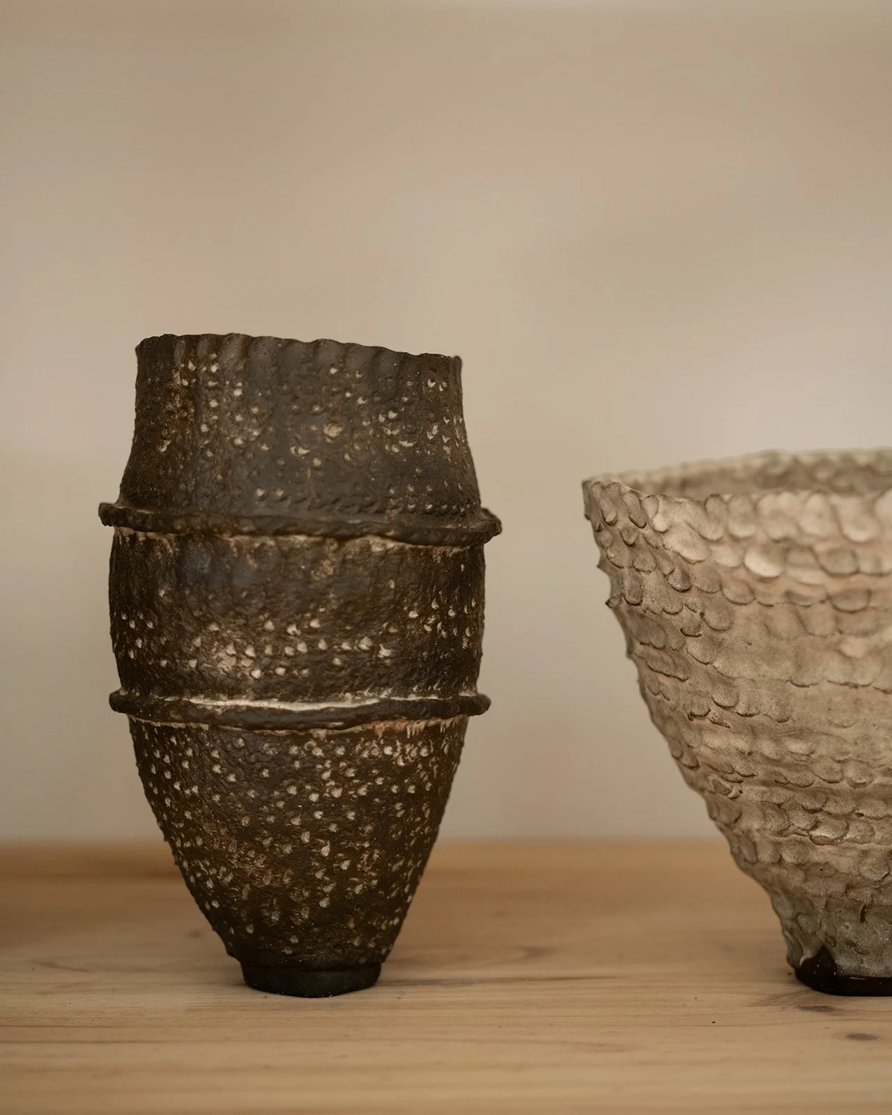 I work primarily with hand-building techniques — coiling, pinching and slab construction — allowing each piece to evolve slowly through touch. Using a range of mid-fire clay bodies, I embed natural materials such as sand, salt and crushed rock directly into the surface, alongside imprints from seed pods, shells and volcanic forms. These gestures create textures that hold both memory and place.