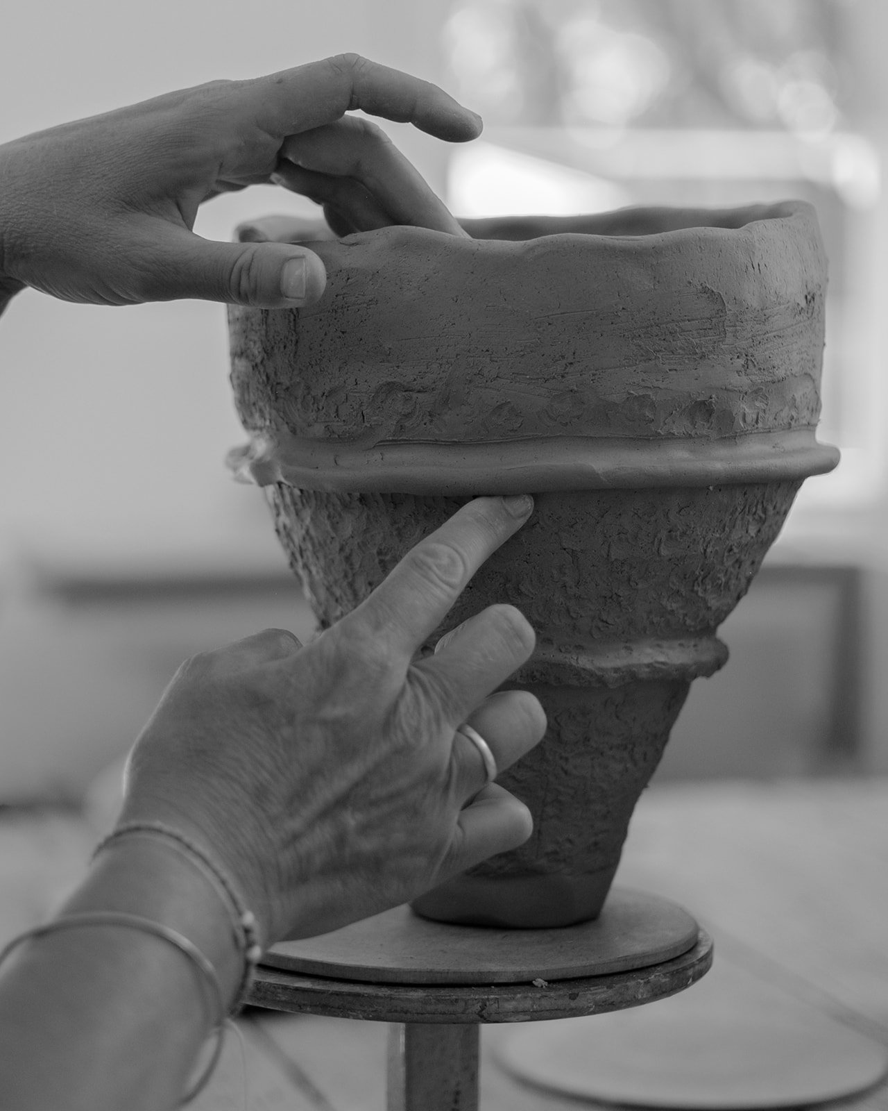 I work primarily with hand-building techniques — coiling, pinching and slab construction — allowing each piece to evolve slowly through touch. Using a range of mid-fire clay bodies, I embed natural materials such as sand, salt and crushed rock directly into the surface, alongside imprints from seed pods, shells and volcanic forms. These gestures create textures that hold both memory and place.
