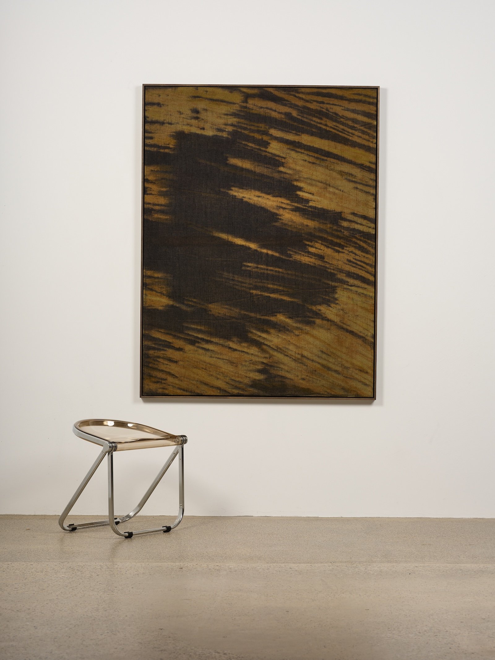 The suspended textile installation in this exhibition extends this thinking into space, creating an environment where material, movement and time are held in suspension.