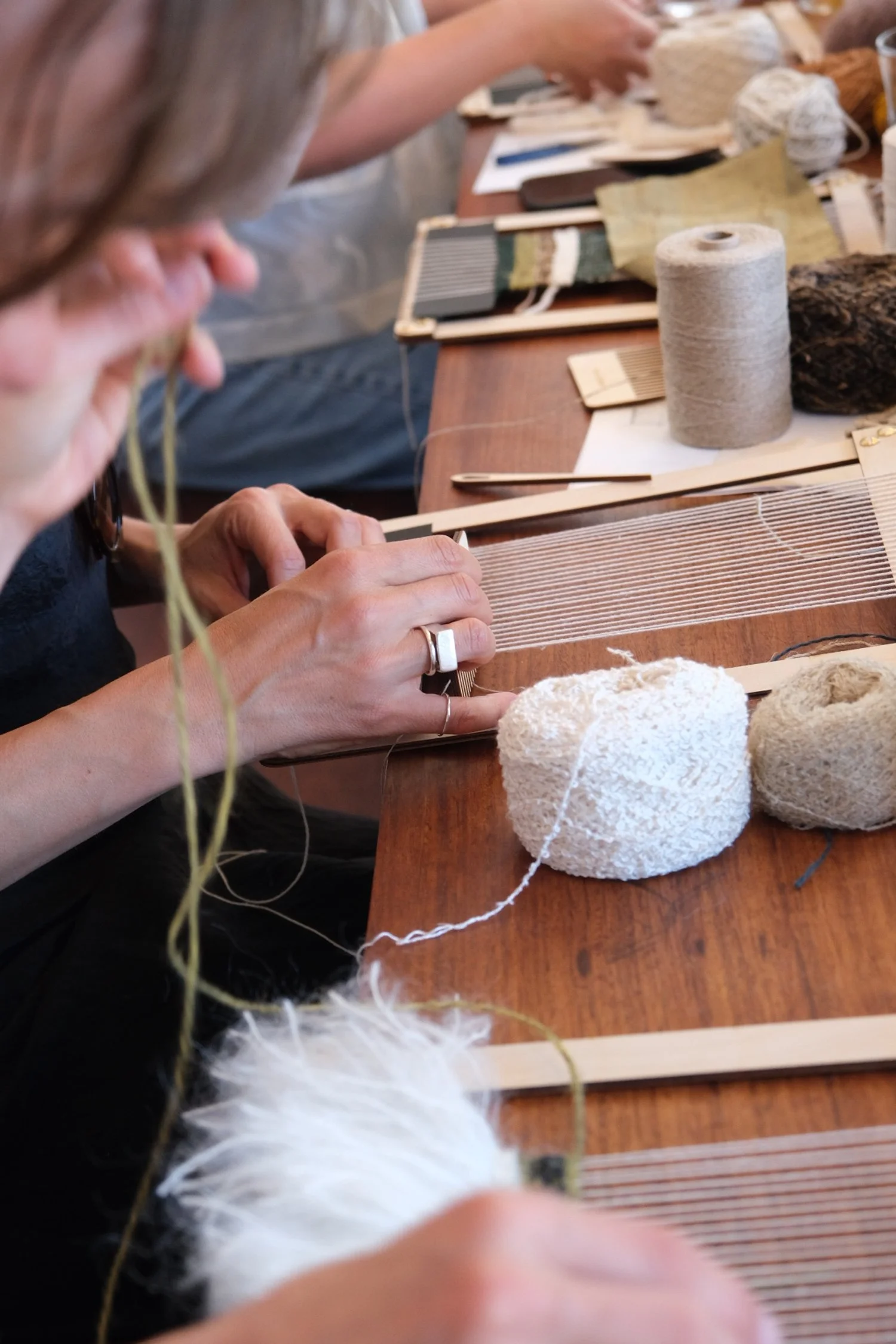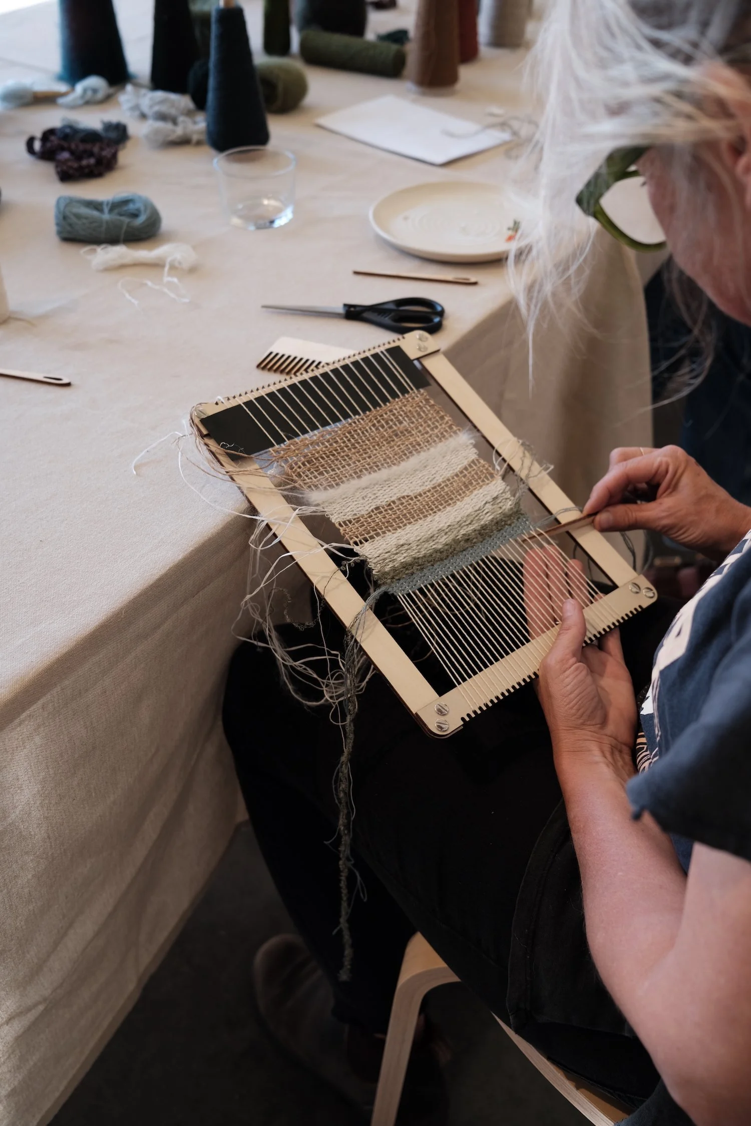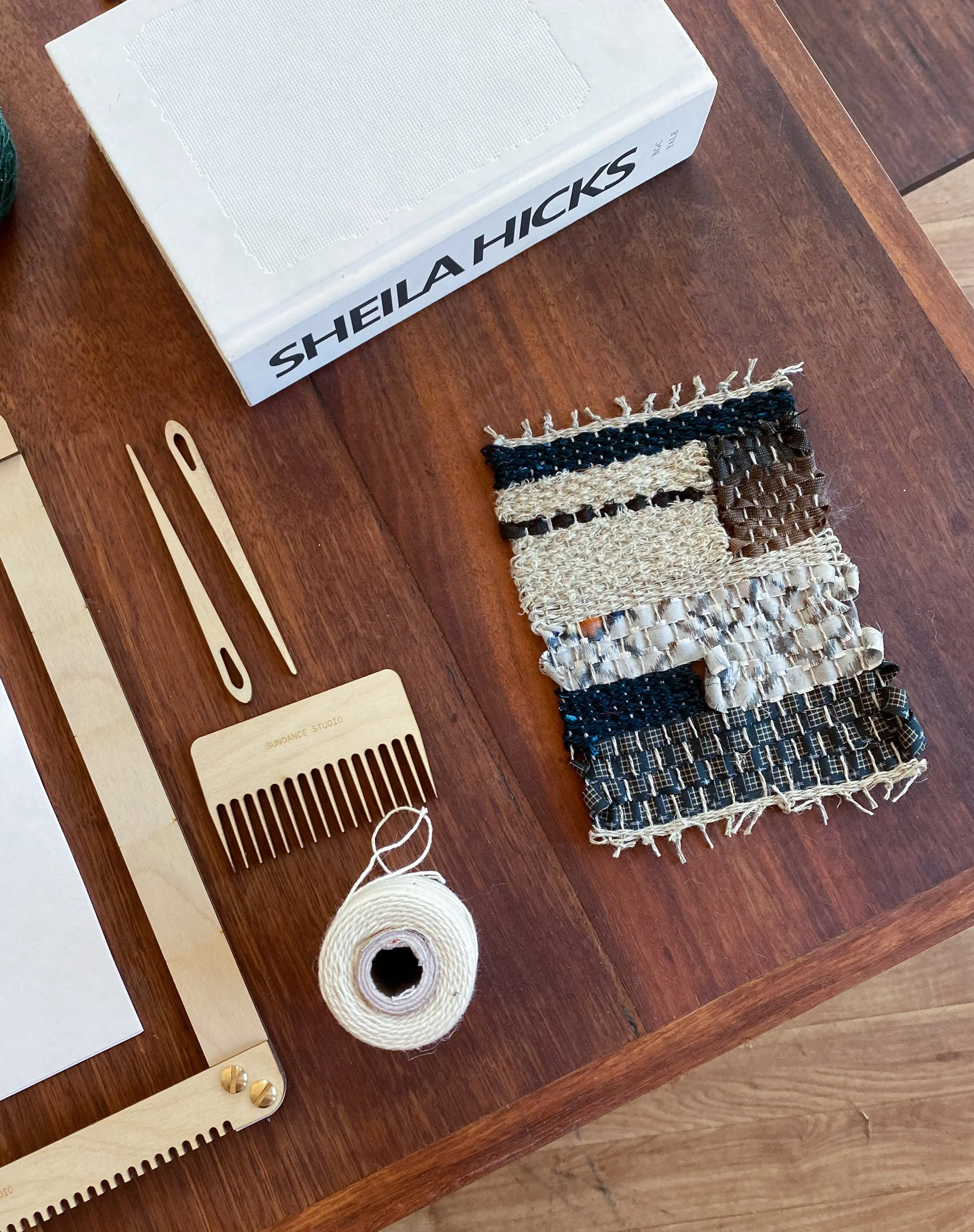 A curated range of natural materials (linen/silk/wool/cotton) to use on the day, as well as extra materials to complete your weaving at home.